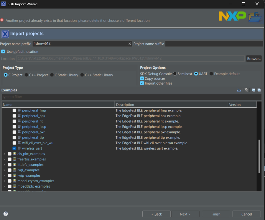 转到快速启动面板 > “导入 SDK 示例...” > frdmrw612 并导入 wireless_uart 示例: