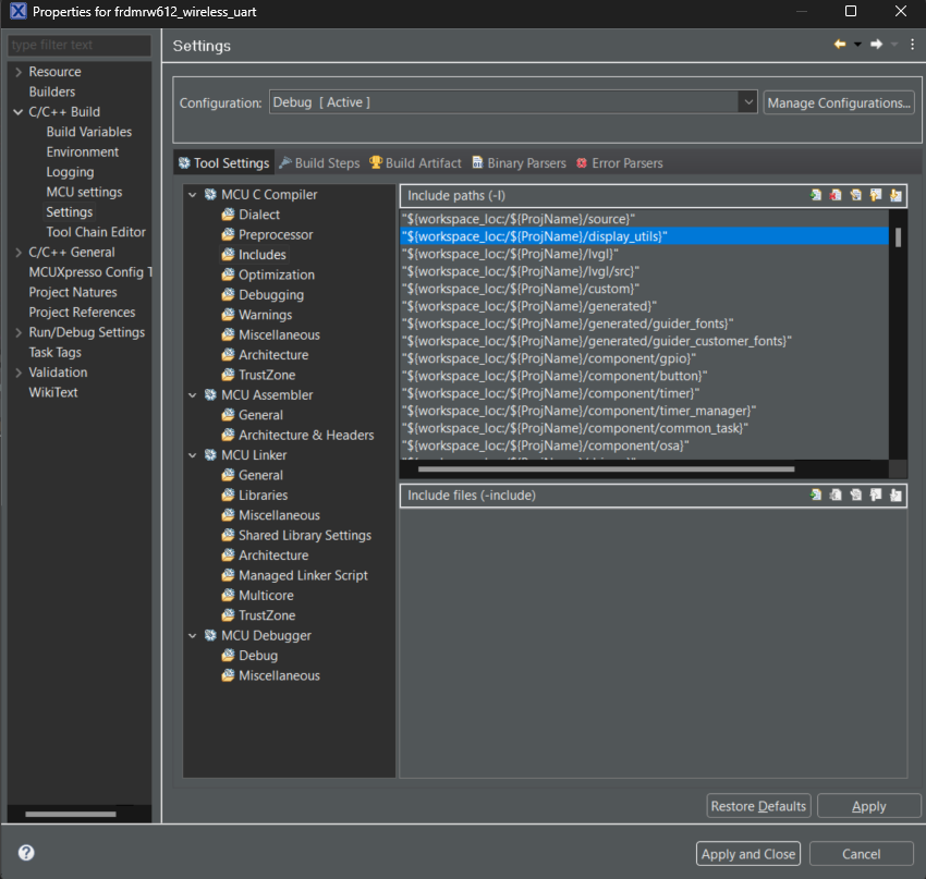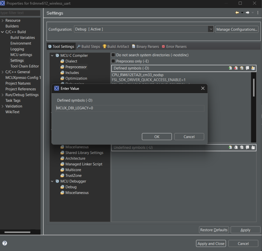 将MCUX_DBI_LEGACY=0符号添加到项目属性 > C/C++ 构建 > 设置 > 预处理器中: