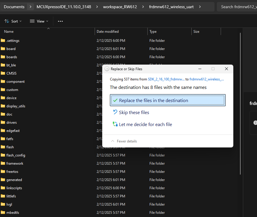 通过将文件复制到现有项目文件来应用补丁(SDK216100frdmrw612wirelessuart_patch):