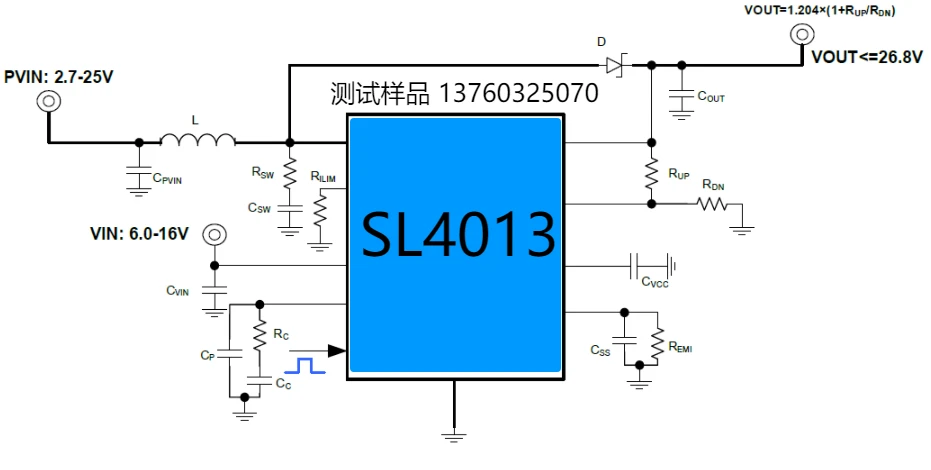 SL4013是一款集成了20mΩ低内阻功率开关管的高效升压转换器,其输入电压范围宽达2.7V至25V,适用于单节或两节锂电池、12V铅酸电池等多种供电场景。该芯片具备高达15A的开关电流能力,最高可输出26.8V电压,固定开关频率为350kHz,转换效率可达96%。