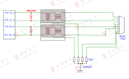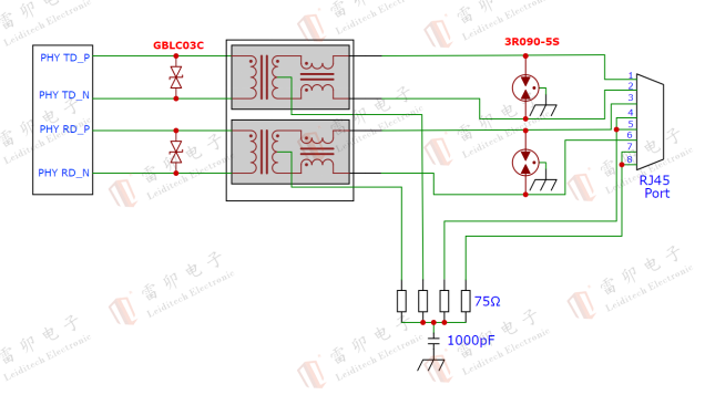 ① 第一级:浪涌泄放:RJ45 端口串联雷卯 3R090-5SGDT(气体放电管),击穿电压 90V,可泄放90%浪涌电流,避免大能量直接冲击 PHY 芯片;