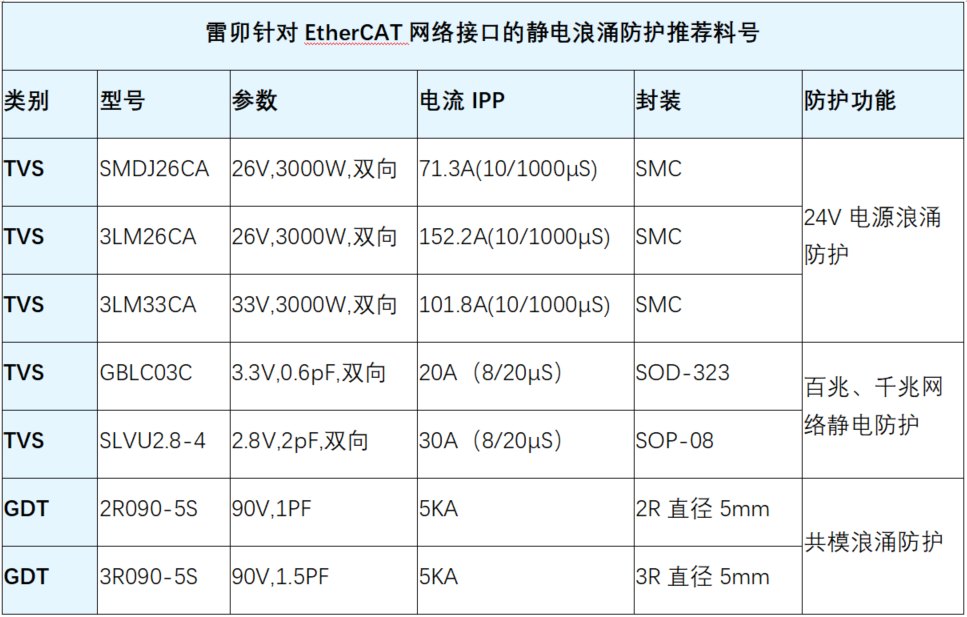 在工业分布式控制场景中,EtherCAT 协议因支持 65535 个从站、纳秒级同步精度,成为汽车生产线、光伏设备、风电变桨系统的核心通信协议;这类场景中,电机启停浪涌、粉尘静电、户外雷击感应等干扰,常导致 EtherCAT 从站断连、帧滑动延迟超标的问题 —— 其根源在于防护方案未匹配 EtherCAT 的 100Base-TX 差分信号特性与拓扑需求。本文结合雷卯 EMC 技术方案,拆解 EtherCAT 协议的专属防护逻辑。
