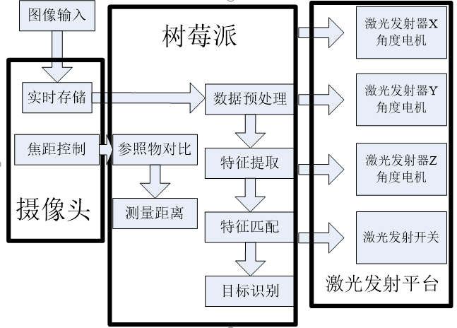电力输电线异物图像识别激光清理系统系统硬件主要分为三部分,分别为摄像头、树莓派和?激光发射平台。整体硬件设计系统框图如图2所示: