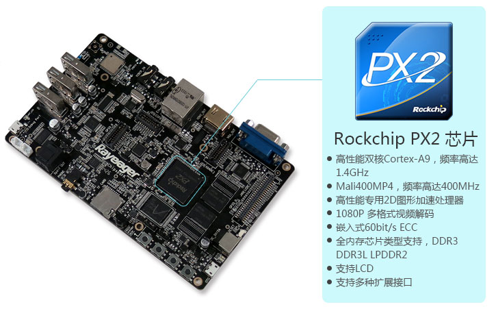 Rayeager PX2拥有强大的四核Mali-400MP4 GPU,频率高达400MHz。能轻松处理各种复杂的图形图像处理工作,可以广泛应用到智能家居监控、识别以及户外*等场景。